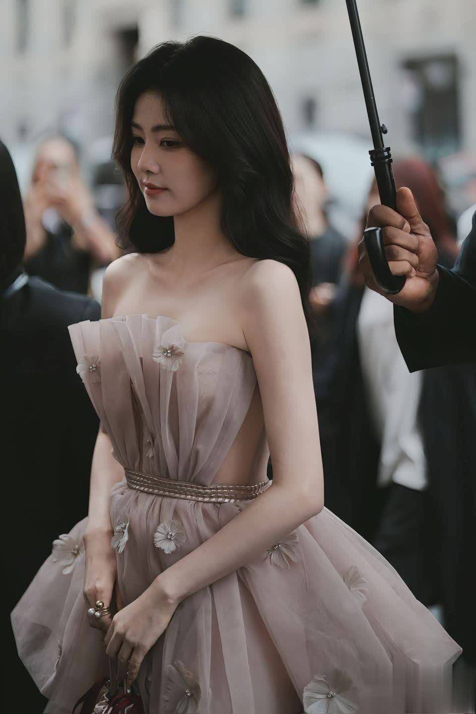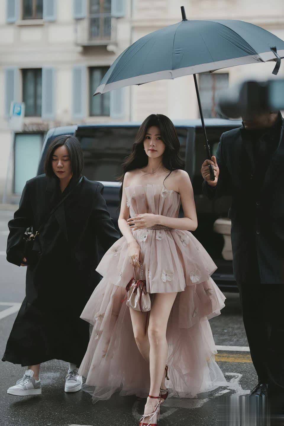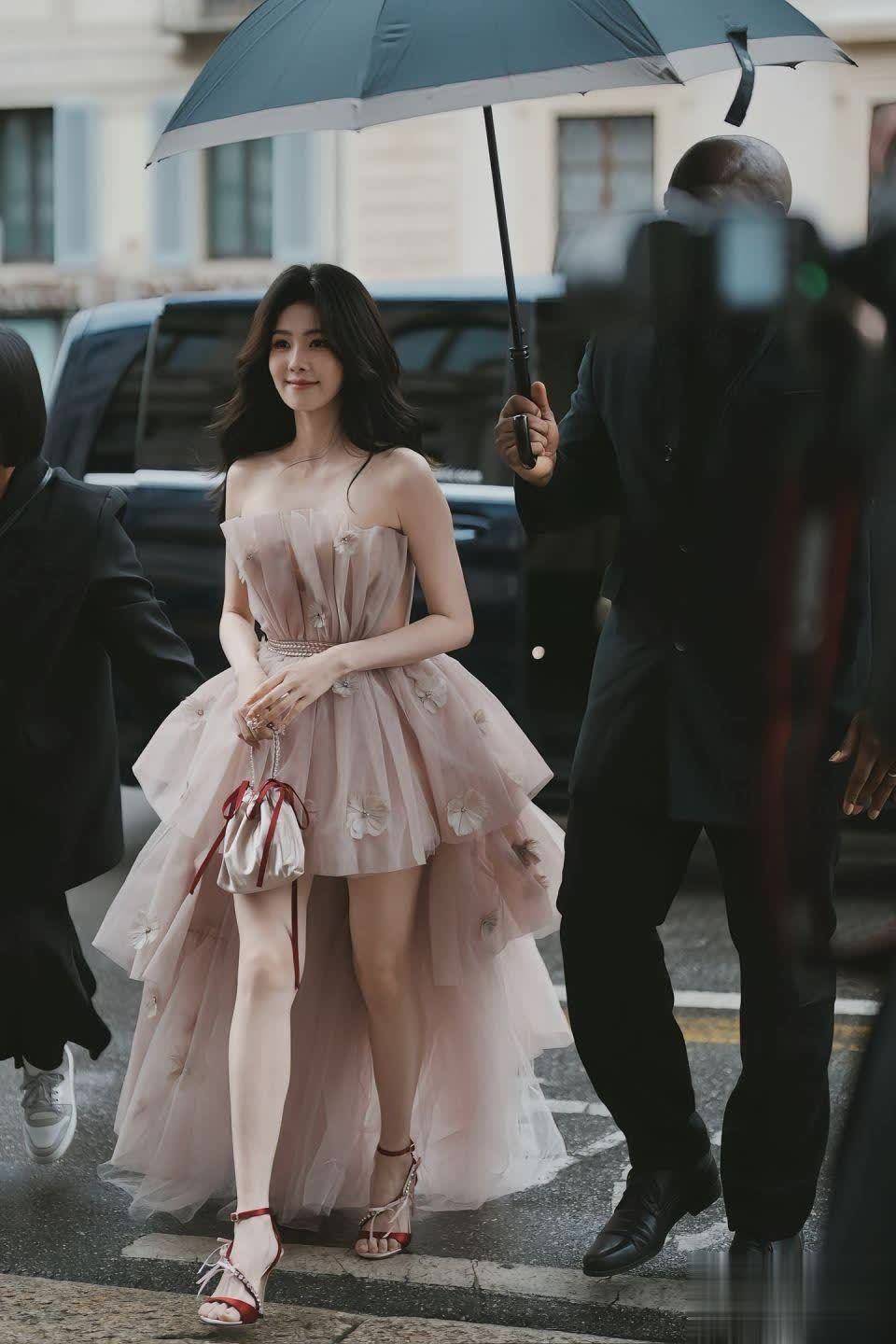 金色小手包系着红丝带,为柔美造型注入一丝灵动。白鹿轻抚胸口的动作自然大方,撑伞的工作人员与模糊人群衬托出她作为公众人物的专业态度。据说这身造型是她亲自参与搭配的,审美在线!