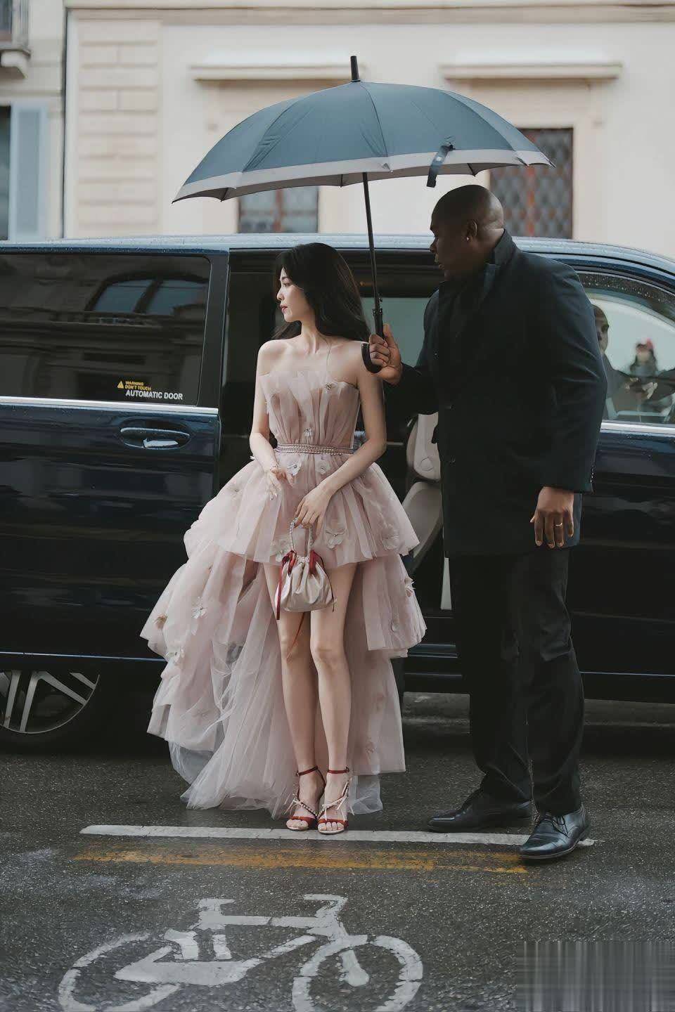 细雨中,纱裙像被打亮的柔光滤镜,层层叠叠的薄纱泛着细腻光泽。站在车旁,纱裙前短后长的设计优势彻底显现:前侧露出纤细美腿,后侧拖尾如瀑布般垂落,高腰线直接把身材比例拉成 “九头身”。这身段,说是 “行走的衣架子” 都嫌保守。